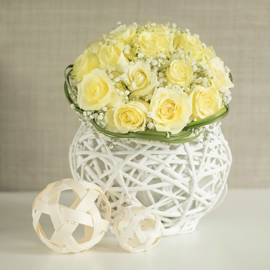 A softly lit floral centerpiece is presented as if ready to be placed on an elegant wedding table in the heart of Notting Hill. At the centre of the scene is a rounded bouquet of pale, buttery yellow roses, pressed closely together so that their velvety petals form a continuous, almost cushion-like dome. Between the roses, dainty clusters of white baby's breath peek through, their tiny star-shaped blooms creating a light, clouded texture that contrasts gently with the fuller rose heads. Just where the flowers meet the container, a narrow band of rich green foliage wraps neatly around the base, acting like a natural ribbon and adding a fresh, botanical outline to the design. The arrangement is nestled in a distinctive white woven vase, whose open lattice of slender strands suggests rattan or wicker reimagined in a contemporary, sculptural form. Light falls through its gaps, casting subtle shadows across the smooth, white tabletop beneath. To one side, two natural-looking woven spheres, one larger and one smaller, rest casually on the surface, their airy, geometric pattern echoing the vase and unifying the overall look. Behind the arrangement, a warm, softly blurred background in tones of beige or light stone recalls the calm interiors of period homes off Pembridge Road, ensuring all attention remains on the flowers and their textured surroundings. The composition feels calm, composed, and quietly celebratory, ideal for wedding receptions, intimate anniversary dinners, or refined gatherings around Notting Hill where a touch of modern design meets classic romantic floristry.